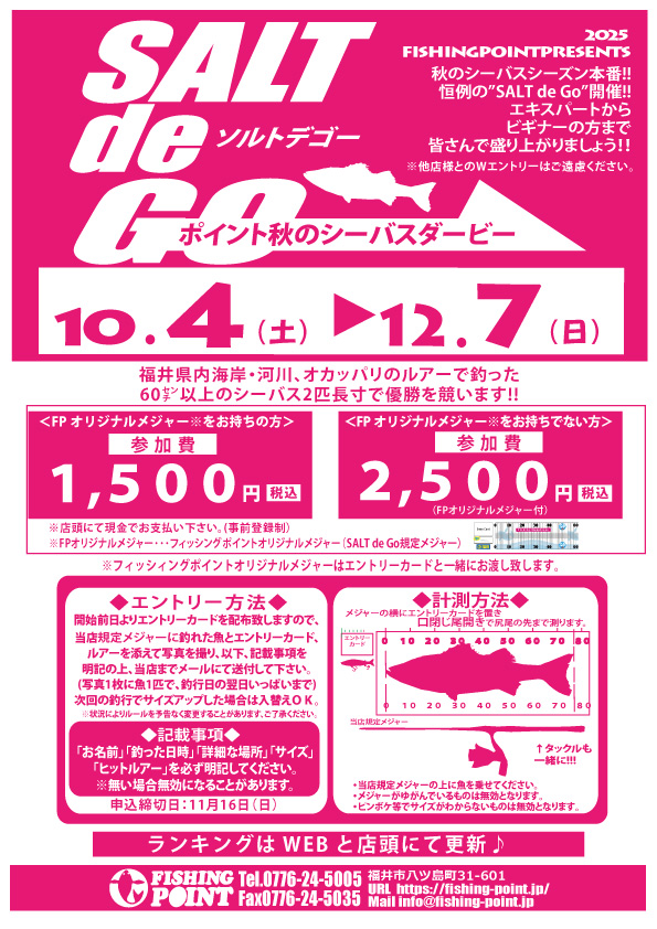 大好評のSALTdeGOポイント秋のシーバスダービー今年も開催します。