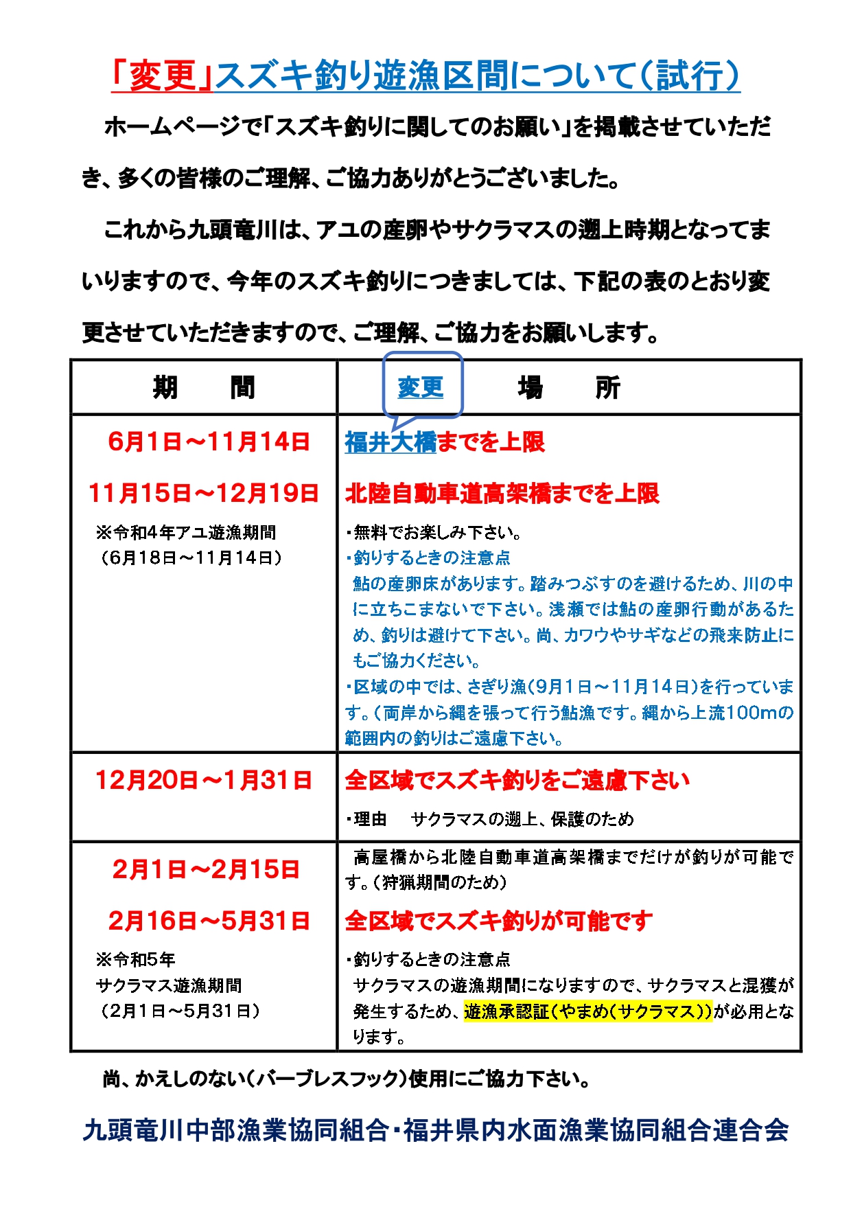 ●九頭竜川 九頭竜橋上流左岸の中藤公園テニス場より上流は、九頭竜川中部漁業協同組合様が決めた鮎の産卵所になっています(看板有り)