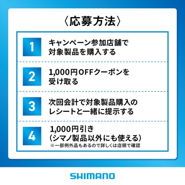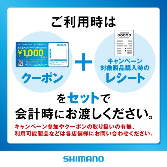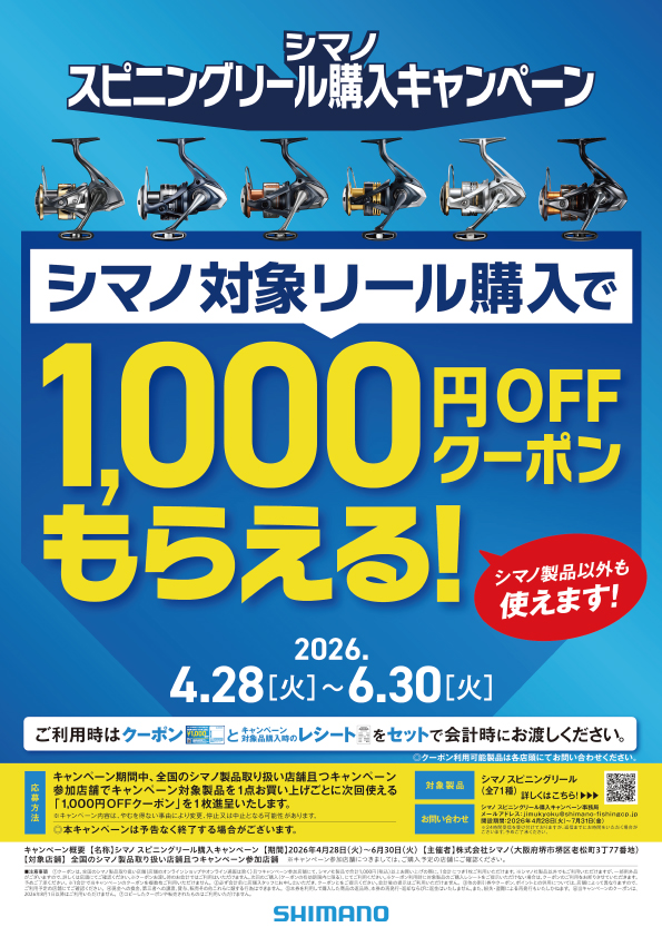 シマノ スピニングリール購入キャンペーン 2026 4.28[火] ~ 6.30[火] シマノ スピニングリール購入キャンペーン 開催中!! キャンペーン期間中、フィシングポイントでキャンペーン対象製品を1点お買い上げごとに、次回使える 「1,000円OFFクーポン(シマノ製品以外も使えます!)」 を1枚進呈いたします! キャンペーン詳細はこちら 期間:2026年4月28日(火)〜6月30日(火) *本キャンペーンは予告なく終了することがございます。 ・対象機種:シマノスピニングリール(全71機種)